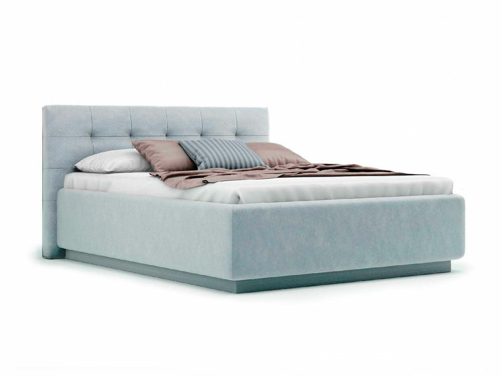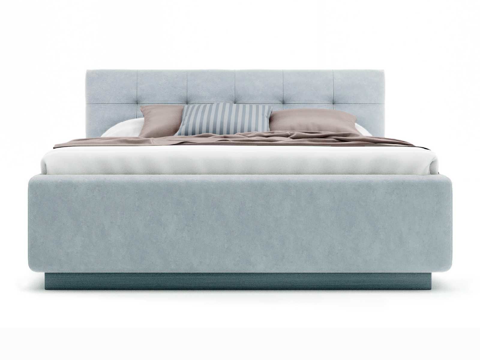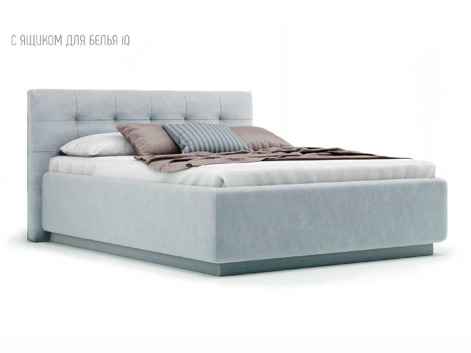 Кровать укомплектована IQ с подъемным механизмом и ящиком для белья без дна (дополнительная платная опция - дно к ящику IQ из HDF (ХДФ). Каркас кровати на цоколе, декоративный чехол на цоколе съёмный. Глубина ящика для белья - 30 см, без ограничения нагрузки на ящик.