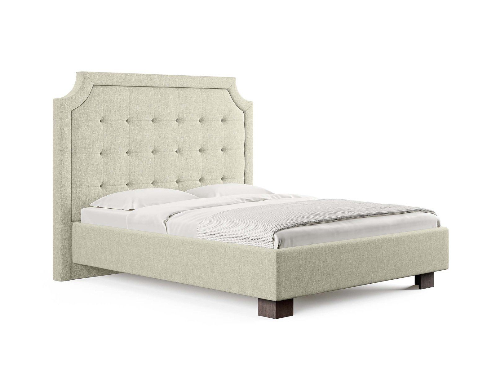 Кровать прекрасно впишется в интерьер от классики до современного стиля и cтанет отличным решением для просторной светлой спальни. Высокая спинка с мягкими утяжками и массивной рамкой выглядит эффектно. Задняя часть спинки кровати выполнена в основной ткани, благодаря этому ее можно установить в центре комнаты. Увеличенная прочность кровати достигается за счет металлического каркаса по периметру. Массивные ножки, выполнены из бука цвета венге. Расстояние от пола до царг способствует легкой уборке под кроватью, в том числе роботом – пылесосом.