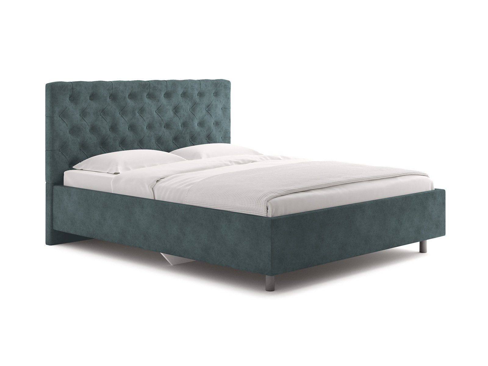 Элегантная интерьерная кровать с изголовьем, украшенным декоративными пуговицами и глубокой пиковкой. Модель изготовлена из ДСП.