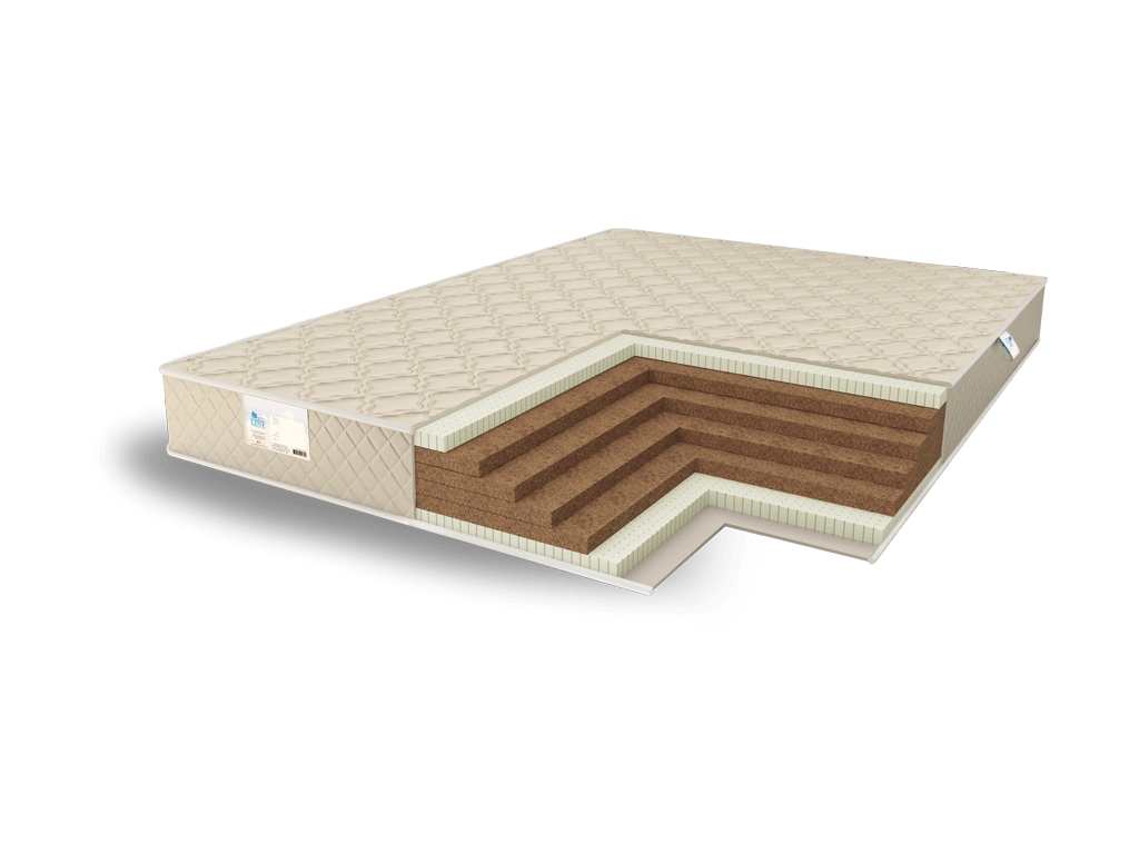 Сама по себе койра – достаточно жёсткий материал, который отлично держит форму матраса и удерживает спину человека на своей поверхности в анатомически правильном положении. Чтобы смягчить твёрдые кокосовые плиты сразу у поверхностей установили нежный латекс. Кроме мягкости он передаёт сторонам и адаптивные качества. Это означает, что поверхность будет эластично повторять все особенности фигуры, обеспечивая тем самым расслабление и комфорт.