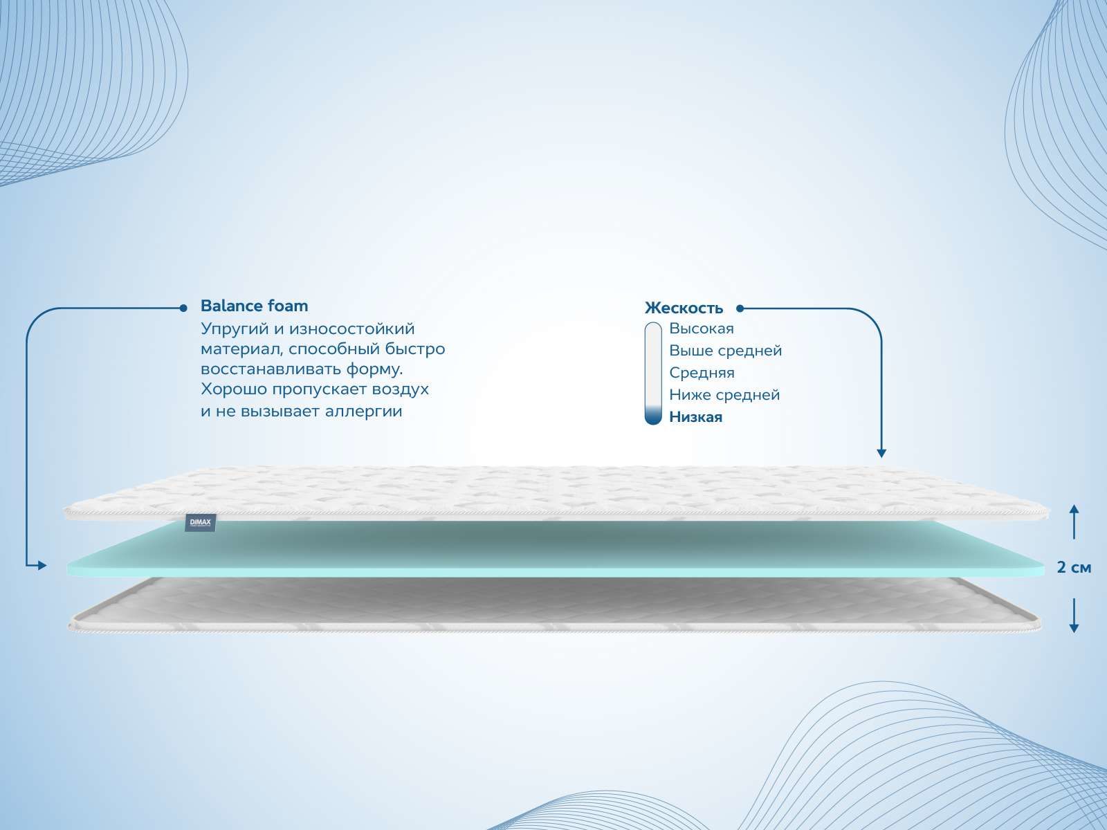 Мягкий и упругий ортопедический наматрасник Димакс Balance Foam 2 см — это топпер, созданный для того, чтобы сделать ваше спальное место ещё более комфортным. Деликатная анатомическая пена Balance Foam превращает поверхность постели в идеальную зону отдыха, нивелируя стыки и неровности на базовой поверхности. Особенно актуально для тех, кто отдыхает на диване или неудобном матрасе.