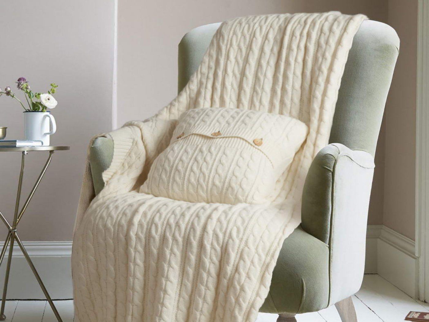 Он очень мягкий, не колючий, шерсть согревает, а структура вязки хорошо пропускает воздух, поэтому укрываться таким пледом комфортно в любую погоду.