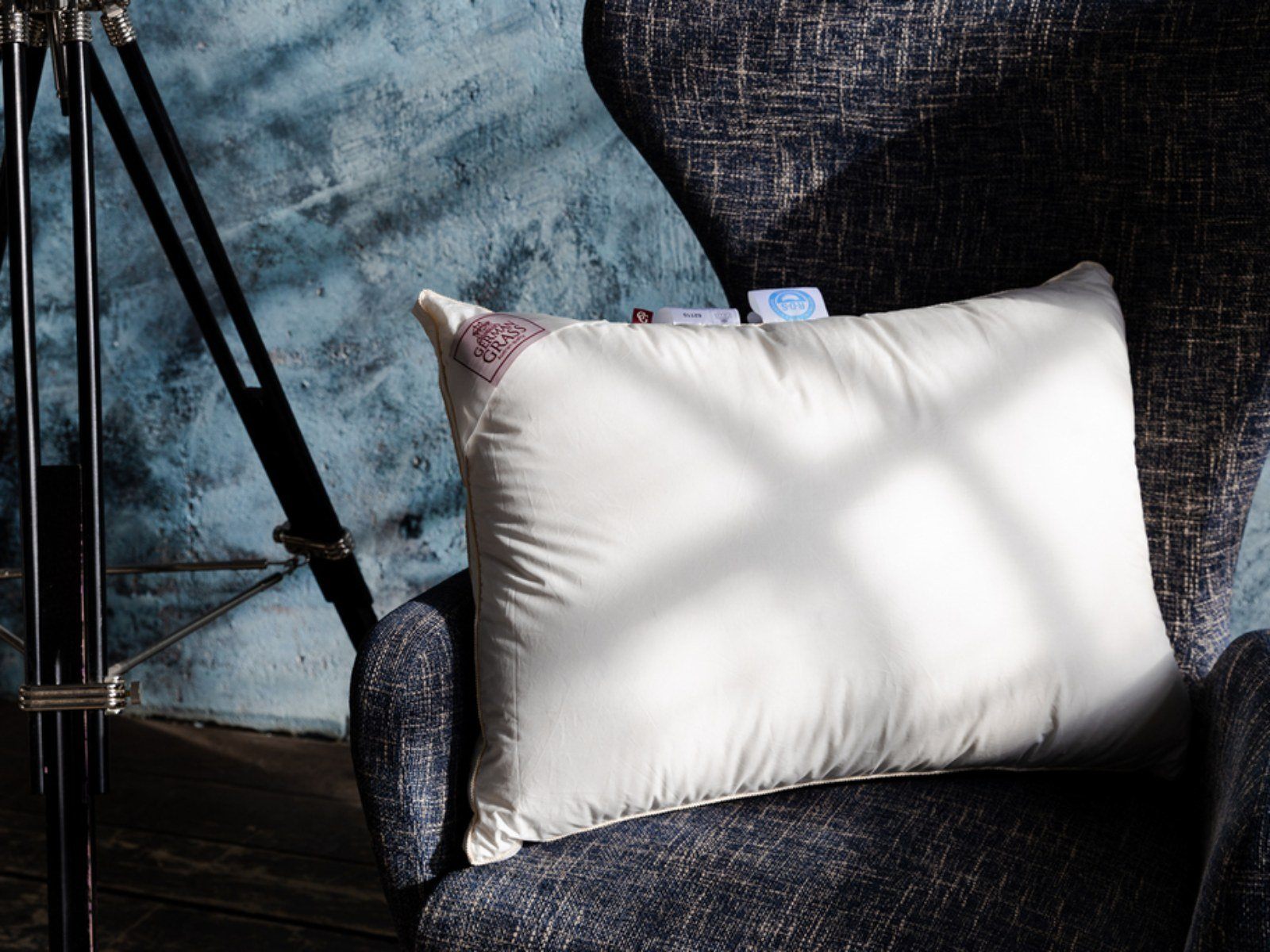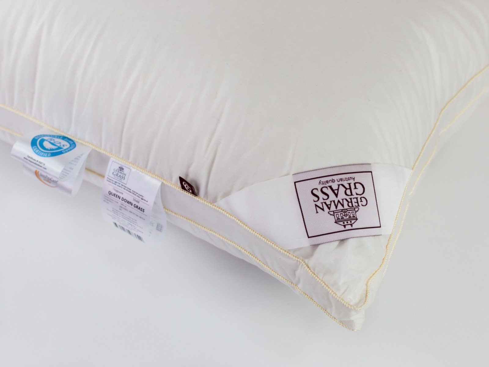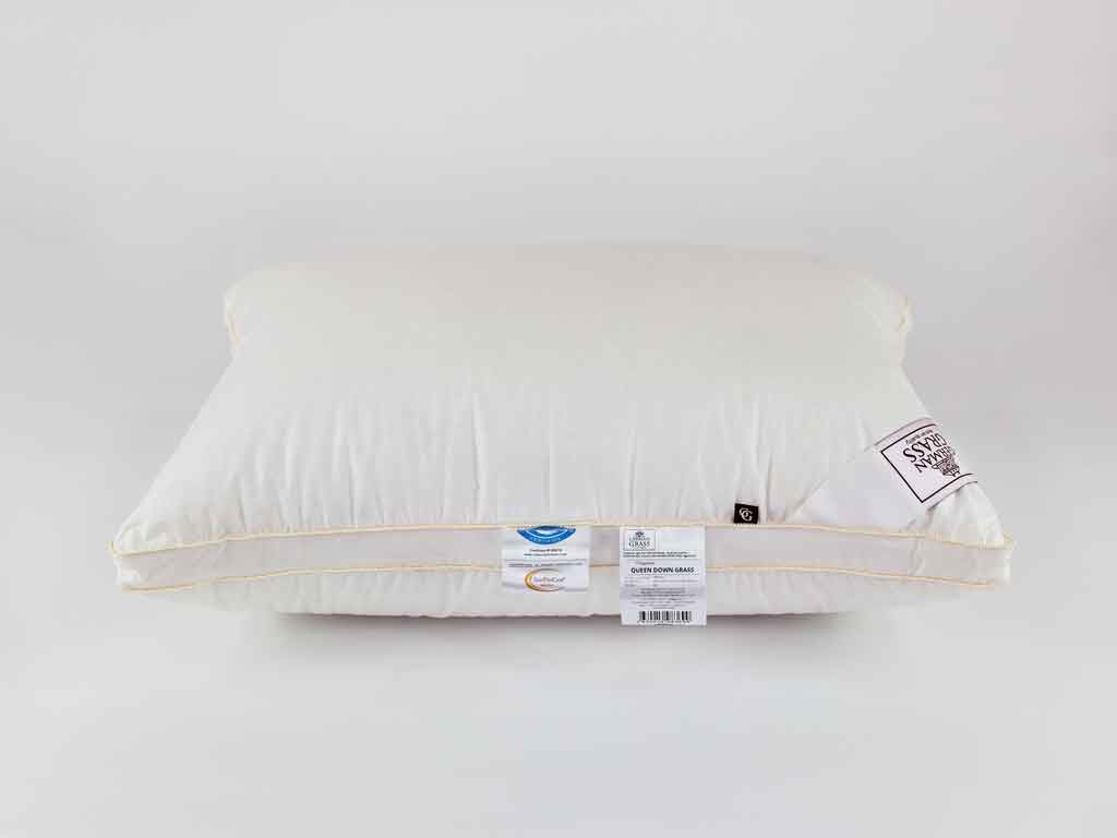 Объемная и высокая подушка Queen Down Grass с бортиком сочетает в себе великолепные немецкие ткани большой плотности и натуральный гусиный пух высшей категории качества.
