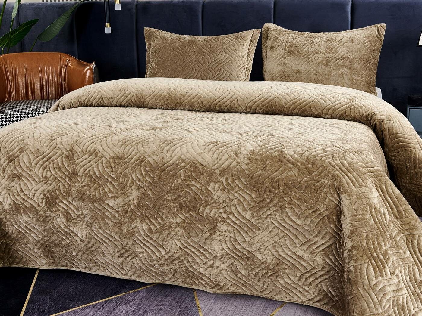 Покрывала «Деварта»: нежность и уют в вашем доме Окунитесь в мир комфорта и изысканности с новой коллекцией мягких бархатных покрывал «Деварта». Эти изделия станут настоящим украшением вашей спальни, добавив ей уюта и элегантности. Покрывала изготовлены из высококачественного бархата, который приятен на ощупь и обладает нежной бархатистой текстурой. Они устойчивы к износу и надолго сохраняют свой привлекательный внешний вид, яркость цвета и мягкость. Благодаря прочной и качественной декоративной стёжке «косичка» наполнитель надёжно зафиксирован внутри изделия. «Деварта» представлена в пяти оттенках: от тёплого бежевого до спокойного серо-голубого. Вы сможете подобрать идеальный вариант для вашего интерьера. Размерный ряд включает два варианта, что позволяет выбрать покрывало, которое идеально подойдёт для вашей кровати или дивана. В комплект входят две наволочки размером 50х70 см. Каждое покрывало аккуратно обшито кантом, а наволочки украшены милыми ушками шириной 5 см. Это придаёт изделиям особый шарм и делает их ещё более привлекательными. Не упустите возможность приобрести эти замечательные покрывала и создать в своём доме атмосферу тепла и уюта. «Деварта» подарит вам не только эстетическое наслаждение, но и незабываемые ощущения при каждом прикосновении.
