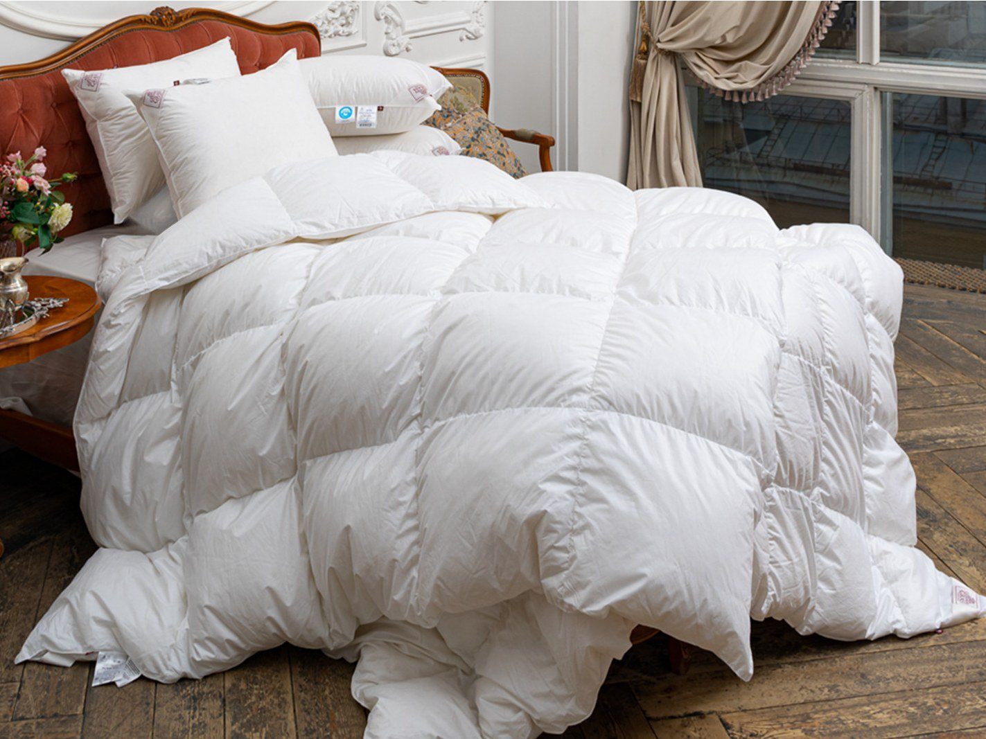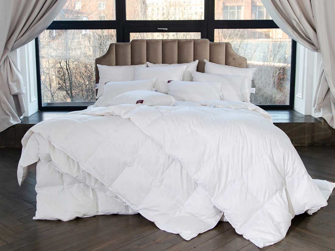 Наполнитель: 100% новый, гусиный белый пух высшего качества, отсортированный вручную, с коэффициентом упругости (Fill Power) не менее 800ед.
